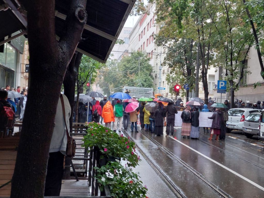 Nakon što je policija pokušala da ubedi protivnike Prajda da se sklone ispred Ustavnog suda, došlo je do guranja između policijskog kordona i protivnika Prajda, nakon čega je policija privela nekoliko demonstranata.